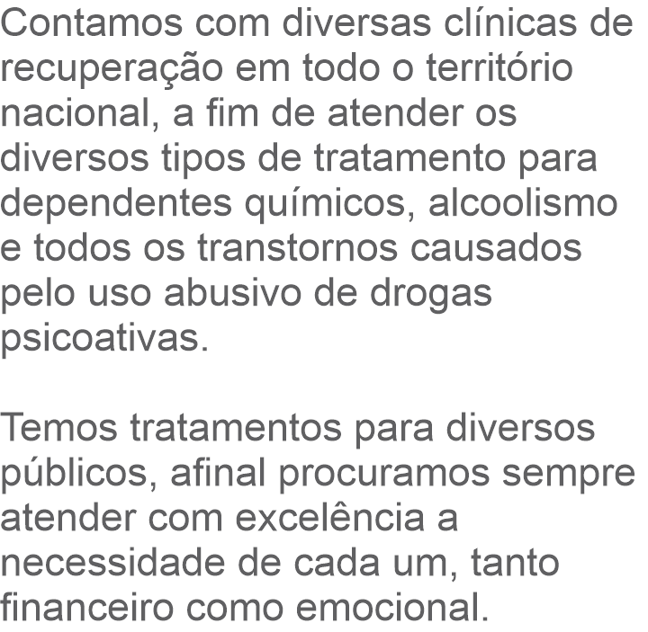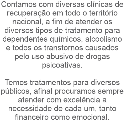 Dispomos de Unidades com atendimento a perfil específico para cada residente. Temos Masculinos, Femininas ou Adolescente sempre divido por Sexo ou Idade e devidamente credenciada